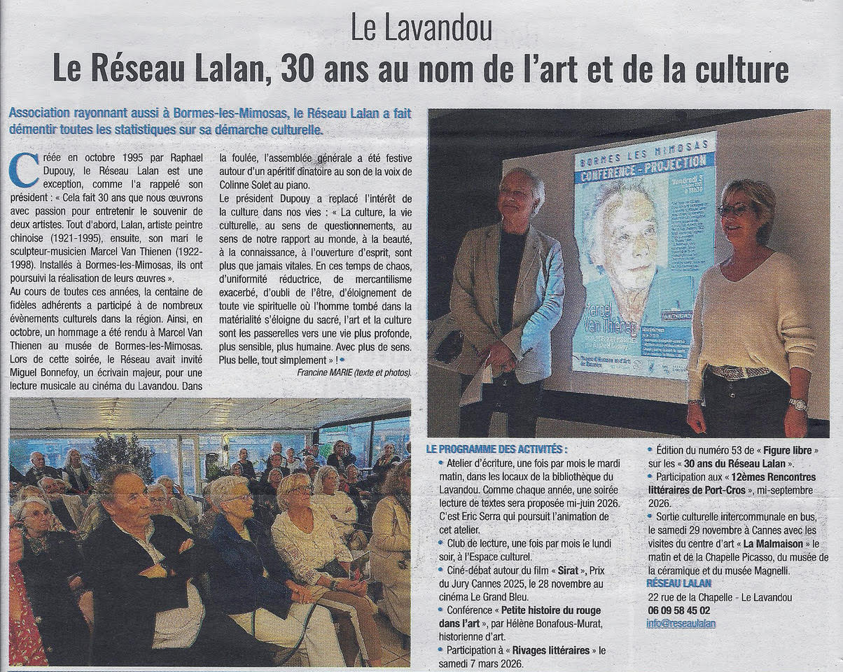 Pour fêter ses 30 ans d’existence et témoigner de sa vitalité, le Réseau Lalan propose une conférence-projection sur l’instigateur de cette association, le sculpteur et musicien Marcel Van Thienen (1922-1998). Animé par Raphaël Dupouy, président du Réseau Lalan, cet hommage sera accompagné de la présentation d’une